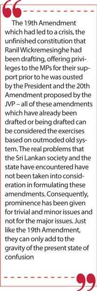 The real problems that the Sri Lankan society and the state have encountered have not been taken into consideration in formulating these amendments. Consequently, prominence has been given for trivial and minor issues and not for the major issues. Just like the 19th Amendment, they can only add to the gravity of the present state of confusion.
