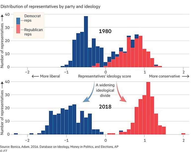 The polarisation is growing as the Republican-Democrat divide is intensifying greatly in issues such as government, race, immigration, national security, environment protection, gun control, abortion, trade, etc., which were already high during the Obama years but now have reached a new high under Donald Trump.