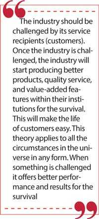 The industry should be challenged by its service recipients (customers). Once the industry is challenged, the industry will start producing better products, quality service, and value-added features within their institutions for the survival. This will make the life of customers easy. This theory applies to all the circumstances in the universe in any form. When something is challenged it offers better performance and results for the survival.