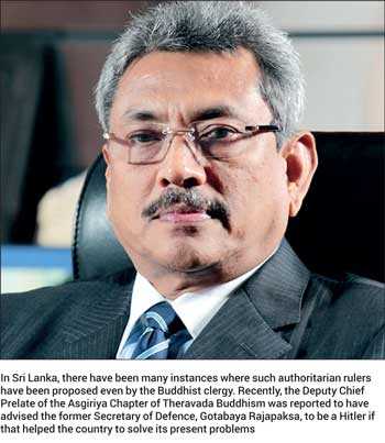 The crux of the argument was that people in Sri Lanka had been a lazy lot compared to those who lived here in ancient times. Hence, to force them to work, a strict ruler was necessary. Under democracy, that could not be done, because people can vote such disciplinarians out of power. More recently, the Deputy Chief Prelate of the Asgiriya Chapter of Theravada Buddhism was reported to have advised the former Secretary of Defence, Gotabaya Rajapaksa, to be a Hitler if that helped the country to solve its present problems.
