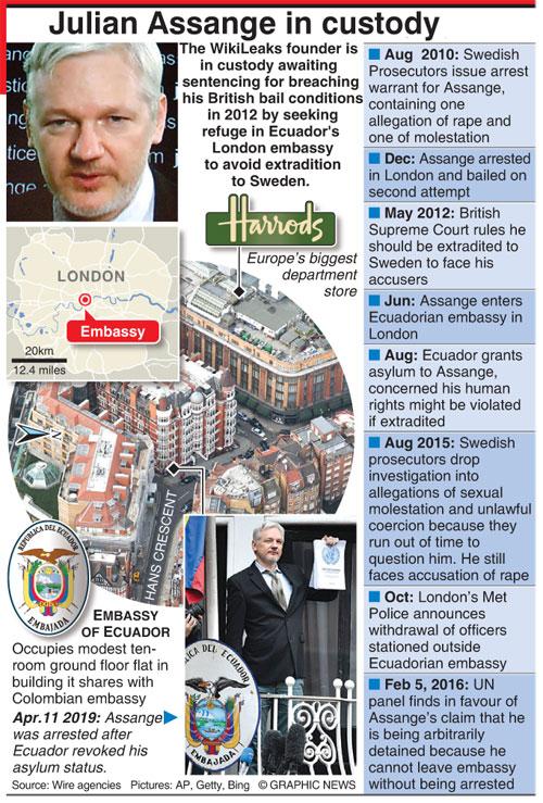 Aussie national Assange’s troubles began in August 2010 when he returned to London after a visit to Sweden. Two Swedish women accused him of rape and molestation. He was arrested and granted bail. In May 2012, Britain’s Supreme Court ruled that he should be extradited to Sweden. Fearing that he would be re-extradited to the US, Assange found refuge in the Ecuadorian embassy in London in June 2012. After seven long years as a virtual detainee in the embassy, Assange was arrested on April 11. This came after Ecuador’s new government, seen to be a willing US poodle, ended the asylum granted to him and allowed the British police to enter the embassy and drag Assange away. This was, perhaps one of the darkest moments in Britain’s media freedom history.