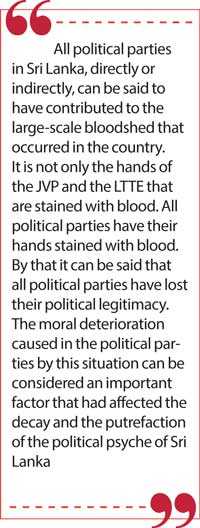 In addition, the leftist parties also had to abandon their anti-UNP stand and act as enthusiastic supporters of the program launched for suppressing the JVP insurrection. As the JVP had adopted a policy of killing all political opponents, all leftist political parties, leftists ideological movements and former JVPers who had deserted the party were compelled to support and work with the war strategy of the Government and the security forces, as direct or indirect partners of the program. When Eelam war was in progress in the north, things happened in a similar way. All other political parties in the north were compelled either to support the war strategy of the LTTE or the counter strategy of the Government launched against the LTTE.Thus, all political parties in Sri Lanka, directly or indirectly, can be said to have contributed to the large-scale bloodshed that occurred in the country. It is not only the hands of the JVP and the LTTE that are stained with blood. All political parties have their hands stained with blood. By that it can be said that all political parties have lost their political legitimacy. The moral deterioration caused in the political parties by this situation can be considered an important factor that had affected the decay and the putrefaction of the political psyche of Sri Lanka.