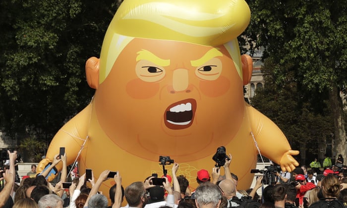A six-metre-high cartoon blimp of Donald Trump was flown by protesters over Parliament Square last time the president visited London in 2018. Photograph: Matt Dunham/AP