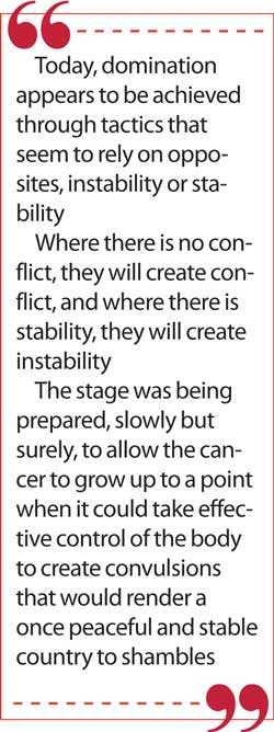 The stage was being prepared, slowly but surely, to allow the cancer to grow up to a point when it could take effective control of the body to create convulsions that would render a once peaceful and stable country to shambles.