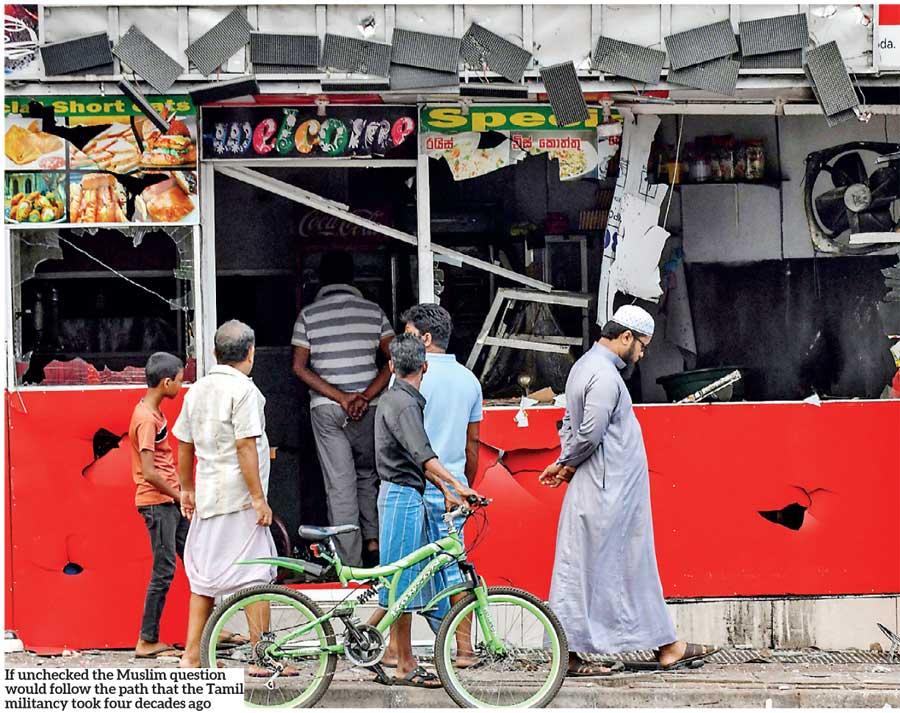 If unchecked the Muslim question would follow the path that the Tamil militancy took four decades ago. Tamils, cheered for nationalist rhetoric of Amirthalingam and Chelvanayakam, but, they neither had strong enough grievances nor a collective suicidal inclination to plunge the community into a war that wiped out half of them, and their place in the country for decades to come.