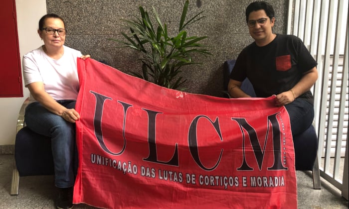 Marli Baffini (left) and Wemerson Silva went from living in tenements to managing the board of Edifício Dandara, a downtown São Paulo building. They hold the banner for the tenement dwellers’ organisation that lobbied the ministry for finance. Photograph: Greg ScuggsThere were social habits to change, too. Visitors would often come to the front desk looking for a friend without knowing their last name. “Come on, there are 500 residents,” Silva says. “If the person doesn’t come with the apartment number, they don’t get in.”