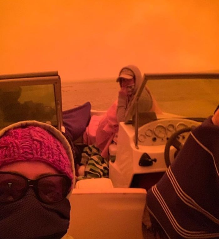 People on a boat taking shelter from the bushfires hitting the area around Mallcoota. Photograph: HANDOUT/Courtesy of Ida Dempsey/AFP via Getty Images