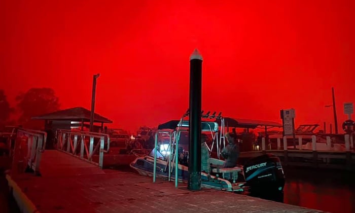 The fire crisis swept up the coast during the day, beginning with dramatic scenes in Mallacoota, in the far south-eastern corner of Victoria, where about 4,000 people fled their homes and took refuge on the beach and in boats as multiple fires surrounded the town, turning the sky black by 9am, and then a hazy red.