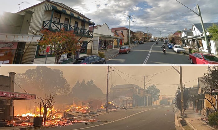 Cobargo, New South Wales, before and after bushfires destroyed a number of businesses on New Year’s Eve. Composite: Google Maps/Twitter