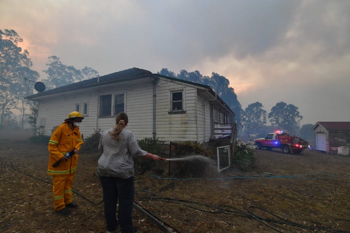 A resident tries to hose down her home in the hope of saving it from nearby bushfires around the town of Nowra in New South Wales. Photograph: Saeed Khan/AFP via Getty Images