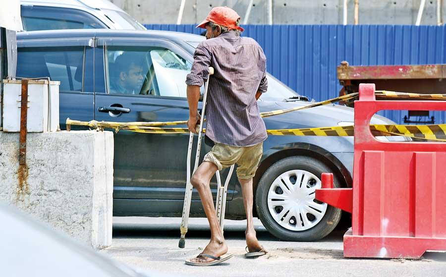 Beggars encounter many barriers when approaching a donor and this picture shows how cruel destiny can be even as thin as this tape which decides whether this less fortunate man gets a few coins