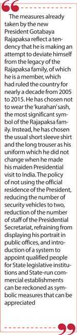 The policy of not using the official residence of the President, reducing the number of security vehicles to two, reduction of the number of staff of the Presidential Secretariat, refraining from displaying his portrait in public offices, and introduction of a system to appoint qualified people for State legislative institutions and State-run commercial establishments can be reckoned as symbolic measures that can be appreciated.
