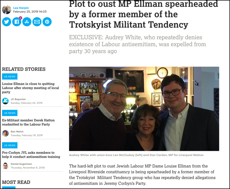 The paper smeared her as being behind a “hard-left plot” and of being at “the center of bullying claims against Jewish MP Dame Louise Ellman” – then the member of Parliament for White’s Liverpool Riverside constituency.
