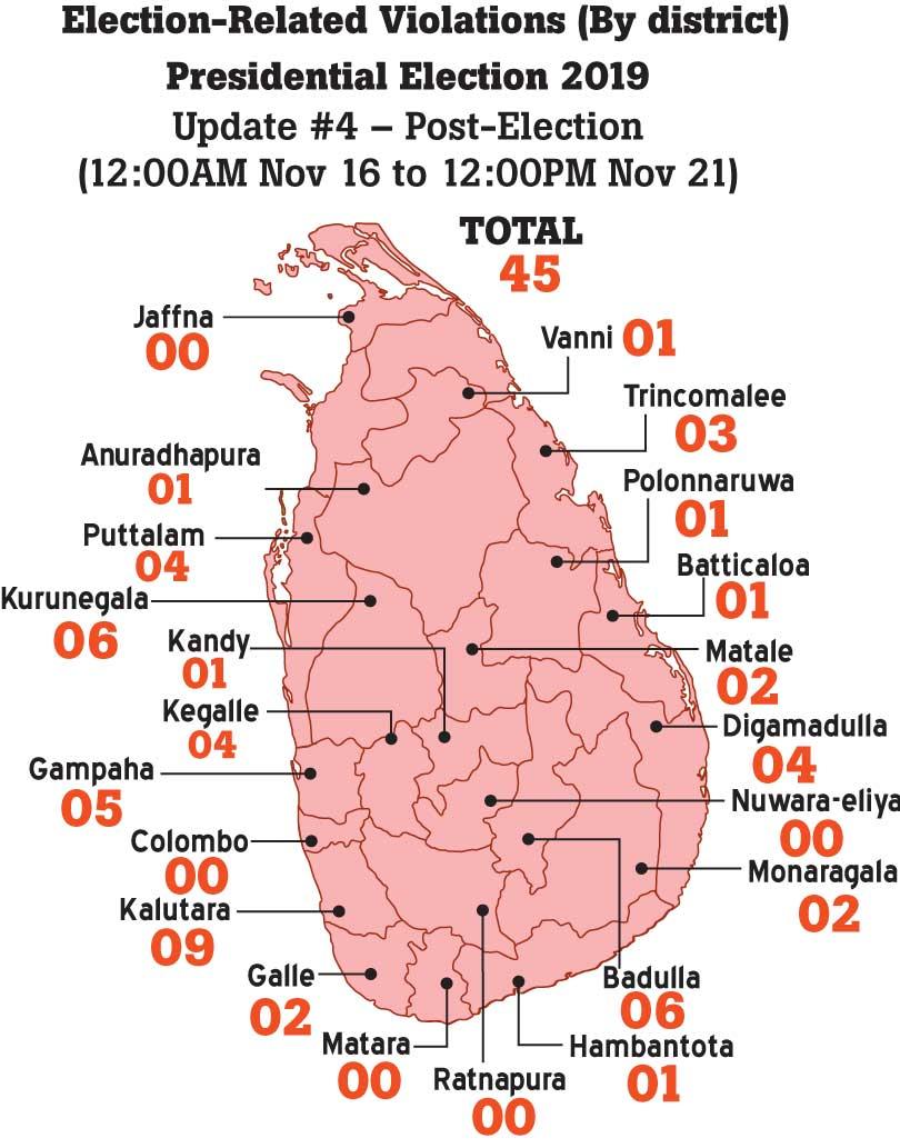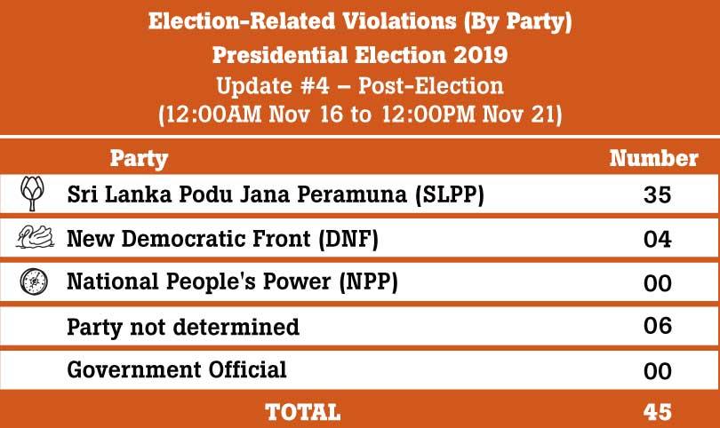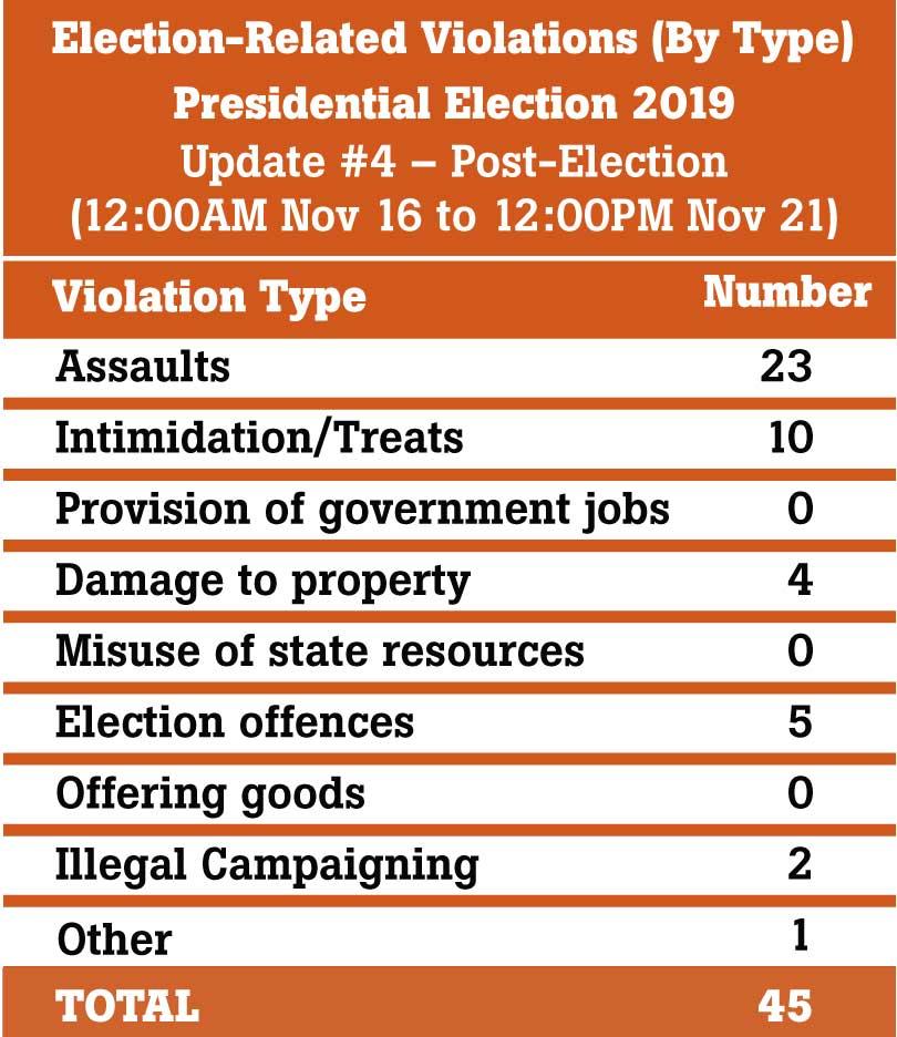 Speaking to , People’s Action for Free and Fair Elections (PAFFREL) Executive Director Rohana Hettiarachchi said that compared to the 2010 and 2015 elections, post-election violations had drastically reduced during the last election. PAFFREL reported 27 incidents of post-election violence up to 25 November.On November 18 SLPP supporters celebrating victory were threatened by NDF supporters in Pallama Kalu Kale junction in Anamaduwa. When SLPP supporters had tried to complain to the police, they had been assaulted.