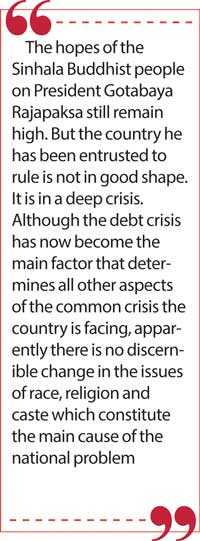 The hopes of the Sinhala Buddhist people on President Gotabaya Rajapaksa still remain high. But the country he has been entrusted to rule is not in good shape. It is in a deep crisis. Although the debt crisis has now become the main factor that determines all other aspects of the common crisis the country is facing, apparently there is no discernible change in the issues of race, religion and caste which constitute the main cause of the national problem.