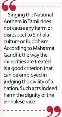 Singing the National Anthem in Tamil does not cause any harm or disrespect to Sinhala culture or Buddhism. According to Mahatma Gandhi, the way the minorities are treated is a good criterion that can be employed in judging the civility of a nation. Such acts indeed harm the dignity of the Sinhalese race.
