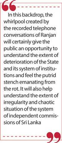 In this backdrop, the whirlpool created by the recorded telephone conversations of Ranjan will certainly give the public an opportunity to understand the extent of deterioration of the State and its system of institutions and feel the putrid stench emanating from the rot. It will also help understand the extent of irregularity and chaotic situation of the system of independent commissions of Sri Lanka.
