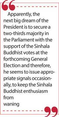 Apparently, the next big dream of the President is to secure a two-thirds majority in the Parliament with the support of the Sinhala Buddhist votes at the forthcoming General Election and therefore, he seems to issue appropriate signals occasionally, to keep the Sinhala Buddhist enthusiasm from waning.