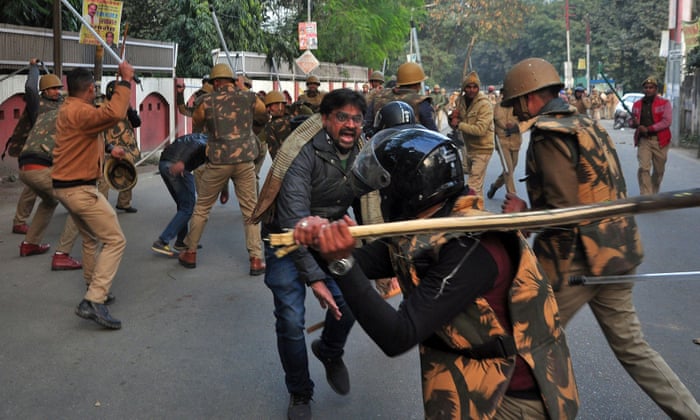 Police officers confront protesters in Lucknow on 19 December. Photograph: STRINGER/ReutersHannah Ellis-Petersen in Delhi and Shaikh Azizur Rahman in Lucknow-