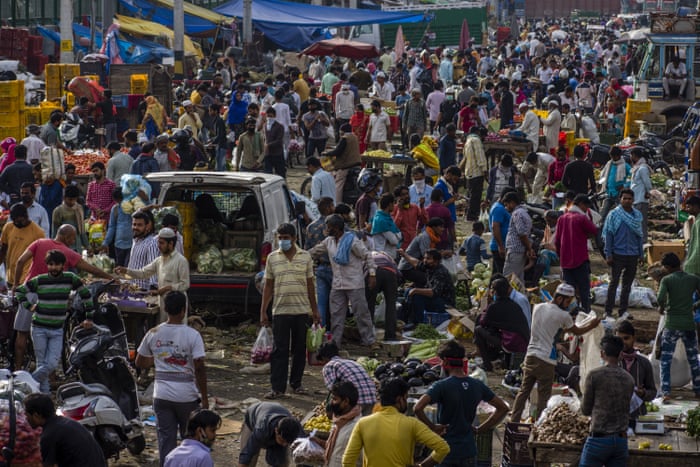 A market in New Delhi was still packed on Thursday despite the lockdown. Photograph: Getty Images