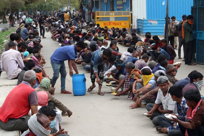 Food aid being distributed at a government shelter in New Delhi on Thursday. Photograph: Anadolu Agency via Getty Images