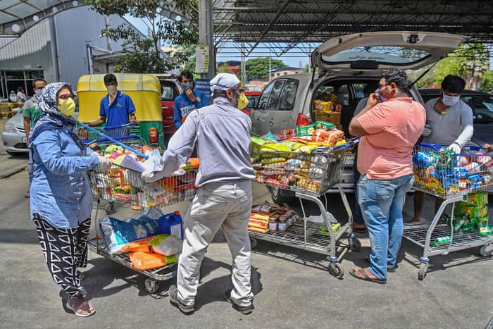 People push loaded trolleys outside a supermarket in Bengaluru. Photograph: Manjunath Kiran/AFP via Getty Images