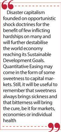 Disaster capitalism founded on opportunistic shock doctrines for the benefit of few inflicting hardships on many and will further destabilise the world economy reaching its Sustainable Development Goals. Quantitative Easing may come in the form of some sweetness to capital markets. Still, it will be useful to remember that sweetness always brings sickness and that bitterness will bring the cure, be it for markets, economies or individual health.