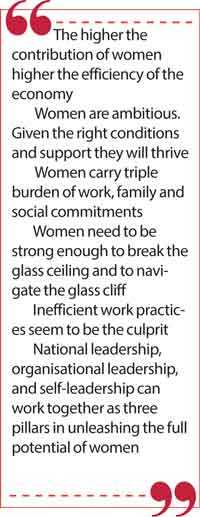 The third pillar is self-leadership where women should be encouraged to change the negative ways they regard themselves. Especially when it comes to glass ceiling women are held back by many ‘labels’ such as ‘bad mothers,’ ‘selfish mothers,’ ‘show-off,’ ‘vanity,’ ‘bossy,’ to mention a few. Women seem to be surrounded by these labels and they require enormous strength to break them. Thus we need to create awareness among women about the status quo and give them leadership skills to break through the barriers and to create opportunities for them. Thus women focused training, awareness and support programmes will assist. This personal empowerment aspect will give women the wings to take off and to fly high may it be as an entrepreneur, intrapreneur or as corporate leaders.