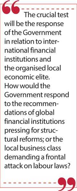 However, the crucial test will be the response of the Government in relation to international financial institutions and the organised local economic elite. How would the Government respond to the recommendations of global financial institutions pressing for structural reforms; or the local business class demanding a frontal attack on labour laws?