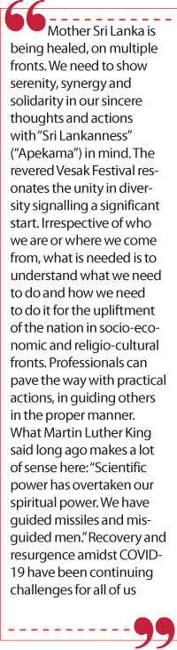Mother Sri Lanka is being healed, on multiple fronts. We need to show serenity, synergy and solidarity in our sincere thoughts and actions with “Sri Lankanness” (“Apekama”) in mind. The revered Vesak Festival resonates the unity in diversity signalling a significant start. Irrespective of who we are or where we come from, what is needed is to understand what we need to do and how we need to do it for the upliftment of the nation in socio-economic and religio-cultural fronts. Professionals can pave the way with practical actions, in guiding others in the proper manner.