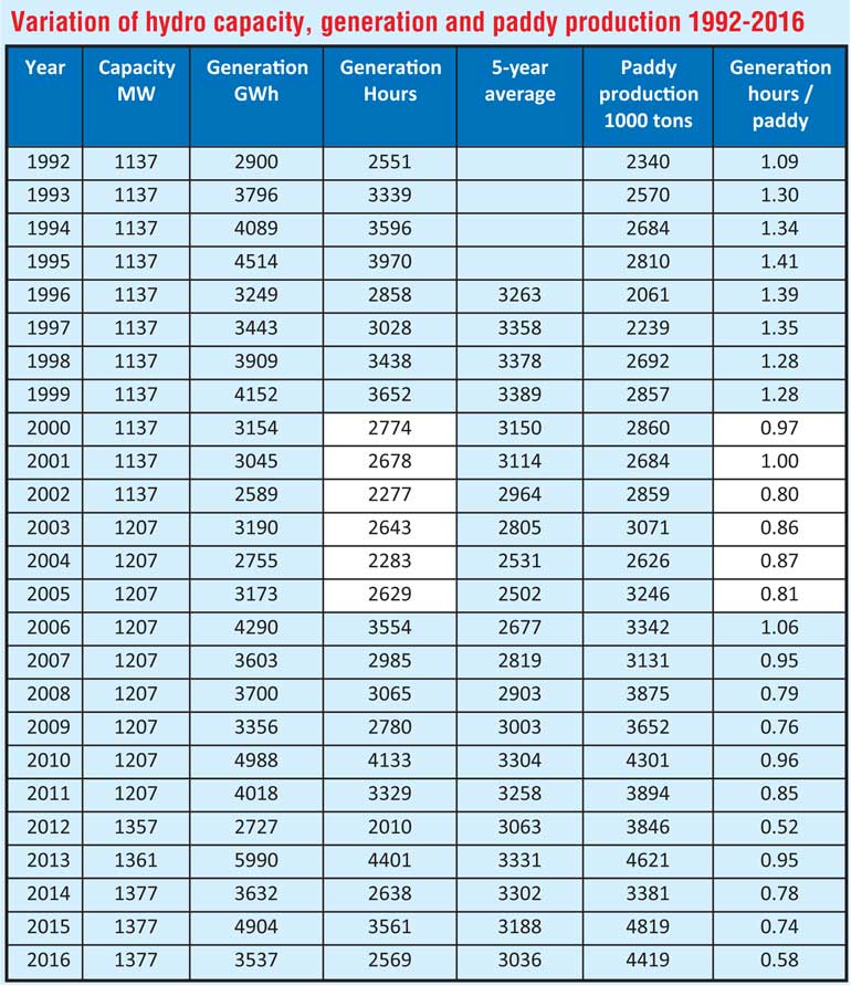 We agree with Dr. Siyambalapitiya that hydropower generation does not remain constant from year to year. In fact even at the PUCSL consultations we mentioned this. But we went further than Dr. Siyambalapitiya and (i) calculated the running hours of hydro by dividing generation by capacity (as the capacity has increased from 1,137 MW in 1992 to 1,377 MW in 2016), (ii) compensated for year-to-year variations by using a five-year moving average and (iii) tried to identify whether rainfall/weather has really been the issue by dividing the annual number of hours of electricity generation by the paddy production and arrived at the table shown. Ten copies of this table were given to the PUCSL Director General at the end of the session.