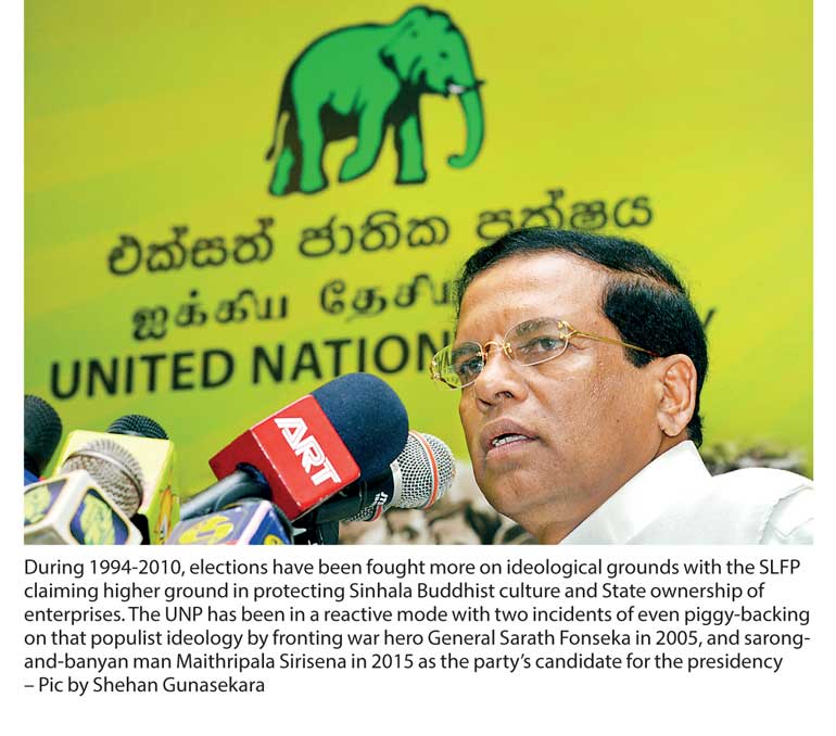 During 1994-2010, elections have been fought more on ideological grounds with the SLFP claiming higher ground in protecting Sinhala Buddhist culture and State ownership of enterprises. The UNP has been in a reactive mode with two incidents of even piggy-backing on that populist ideology by fronting war hero General Sarath Fonseka in 2005, and sarong-and-banyan man Maithripala Sirisena in 2015 as the party’s candidate for the presidency.