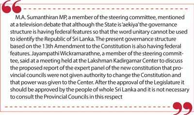 M.A. Sumanthiran MP, a member of the steering committee, mentioned at a television debate that although the State is ‘aekiya’ the governance structure is having federal features so that the word unitary cannot be used to identify the Republic of Sri Lanka. The present governance structure based on the 13th Amendment to the Constitution is also having federal features.