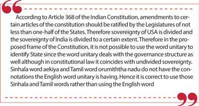 acknowledged that there was a difference in meaning. However, he tried to defend the inclusion of the new Tamil word by adding the word ‘indivisible’ to ensure that Sri Lanka is a ‘united’ country. Most constitutional analysts are of the opinion that the proposed change is aimed at establishing a federal state without using the word federal which is unacceptable to the majority.