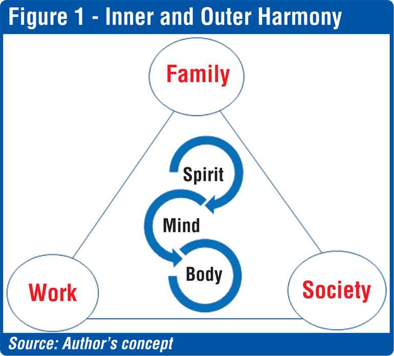 Loehr and Schwartz (2001) in their seminal HBR article titled ‘Making of a Corporate Athlete’, describe vividly the importance of physical, mental, emotional and spiritual ‘capacities’. This essentially points to inner harmony. The spillover effect of it will facilitate the challenge to achieve outer harmony. Figure 1 depicts such combination of inner and outer harmony.