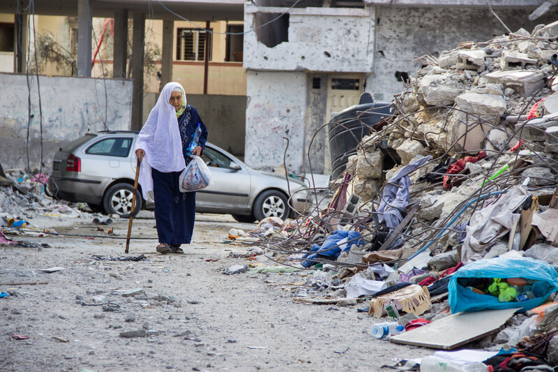 A Palestinian woman walks between the ruins of Beit Hanoun, in the northern Gaza Strip,
