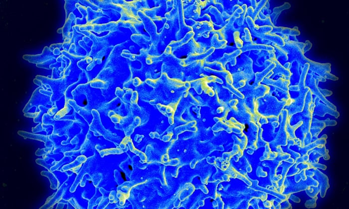 A scanning electron micrograph of a human T-cell. ‘T-cells are a living drug, and in particular they have the potential to persist in our body for our whole lives,’ said researcher Chiara Bonini. Photograph: Alamy