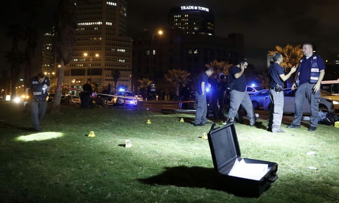Israeli police officers look for evidence near the scene of a stabbing attack in the neighbourhood of Jaffa in Tel Aviv. Photograph: Thomas Coex/AFP/Getty Images