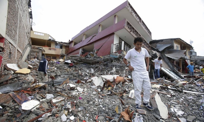 The earthquake struck shortly after night fell on Saturday near Muisne, in a sparsely populated area of mostly small ports and tourist villages about 100 miles from the capital, Quito. Local officials reported deaths in the cities of Portoviejo, the Tarqui neighbourhood of Manta and Guayaquil, where at least one person died after a bridge collapsed on top of a car. Houses were upended or reduced to rubble, some with washing lines still strung up or photos hanging on the walls.