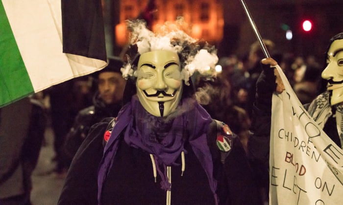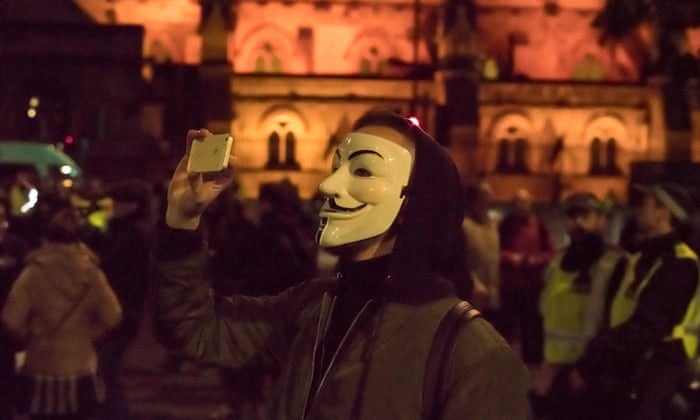 Supporters of the Anonymous hacking collective wore Guy Fawkes masks in reference to the cult pro-revolution film V for Vendetta. Young and older people marched together, shouting and holding banners declaring: “Capitalism, monarchy, change, revolution”.