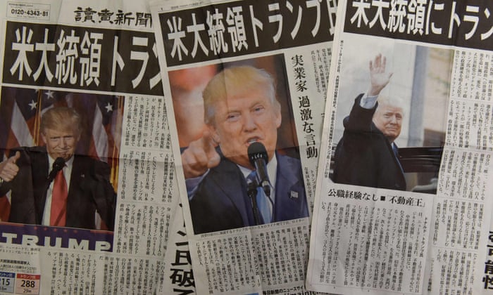 Japanese newspapers report the victory of Donald Trump. Japan’s prime minister Shinzo Abe is a big loser from the election result. Photograph: Toru Yamanaka/AFP/Getty Images