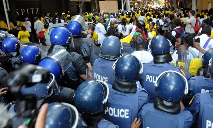 South African police riot squad clash with ANC supporters. Photograph: STR/EPA
