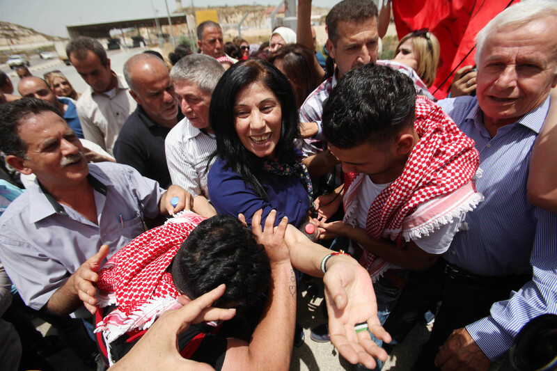 Khalida Jarrar, center, is greeted by supporters at Jbara checkpoint in the occupied West Bank, upon her release from Israeli prison in June 2016. She was rearrested this month.