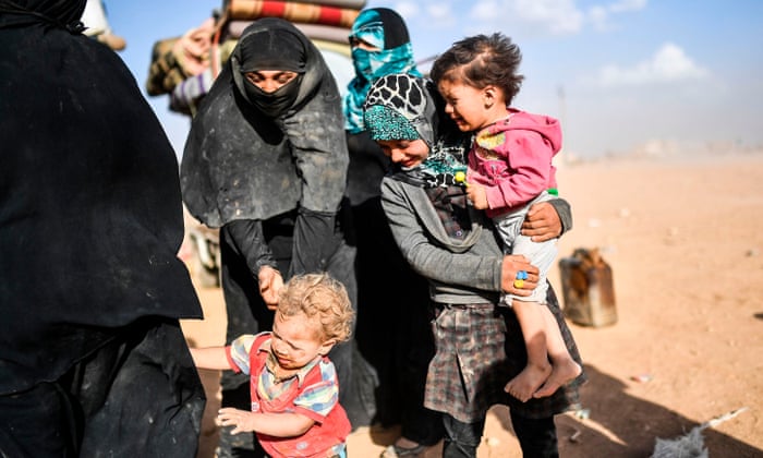 Displaced Syrians on the outskirts of Raqqa this week after fleeing the city of Deir ez-Zor. Photograph: Bulent Kilic/AFP/Getty Images
