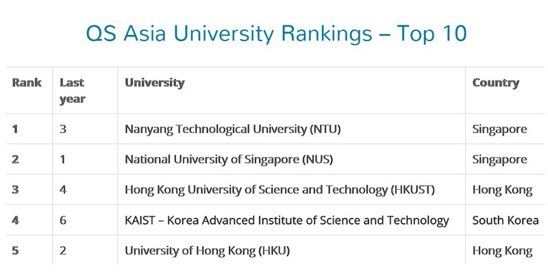 The rankings released today show NTU has beaten its local rival, the National University of Singapore, to the top spot, which the latter held last year but has since dropped to 2nd place this time around.