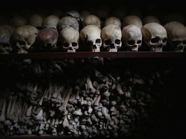 Metal racks hold the bones of thousands of Rwandan Genocide victims inside one of the crypts at the Nyamata Catholic Church Chip Somodevilla/Getty Images
