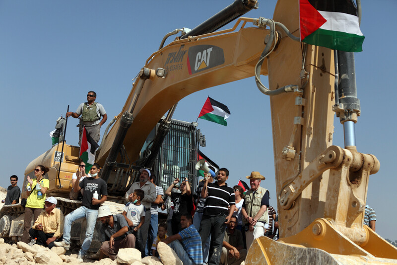 Palestinian residents of the West Bank town of al-Walaja and their supporters block a Caterpillar machine being used to build Israel’s wall in August 2010.ActiveStills