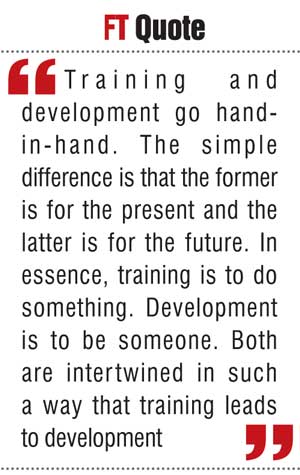 This refers to the need to build people. Training and development go hand-in-hand. The simple difference is that the former is for the present and the latter is for the future. In essence, training is to do something. Development is to be someone. Both are intertwined in such a way that training leads to development.