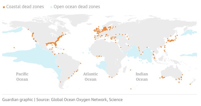 Diaz said the speed of ocean suffocation already seen was breathtaking: “No other variable of such ecological importance to coastal ecosystems has changed so drastically in such a short period of time from human activities as dissolved oxygen.”