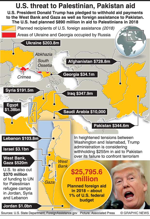 The tweets were followed by action to stop aid. Brandishing foreign aid as a weapon to punish weaker states, Trump’s United Nations envoy Nikki Haley announced the US was withholding $255 million in aid to Pakistan. Palestine was also added to the aid-cut list.